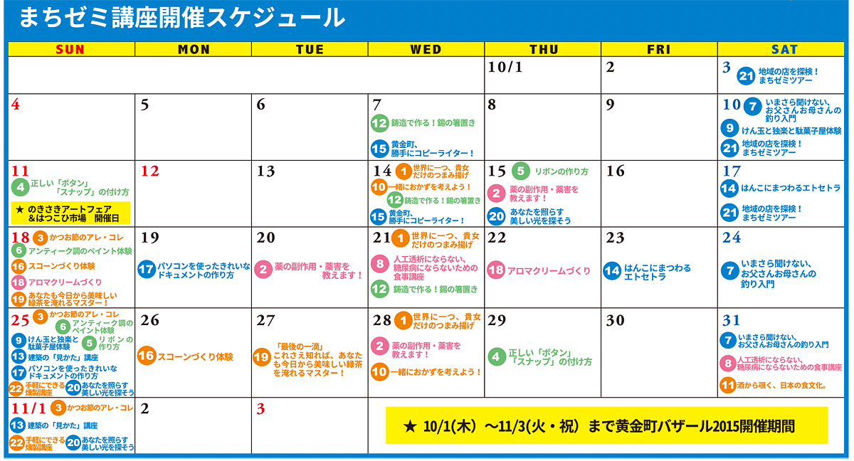 まちゼミは完全予約制になっています。必ず事前に各店舗・アーティストに電話等での申込の上、ご受講ください。受講対象者が制限されている場合もあるので、必ずチラシ・お電話で内容をご確認ください。