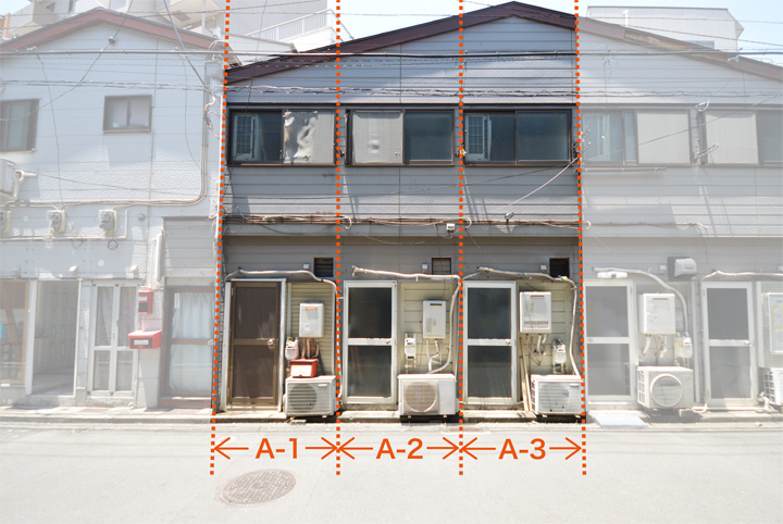 当該地区で活動するアーティストやクリエーターが制作を行うことができる空間のデザインを募集します。隣り合う3軒(1-A~A-3)の中から、1軒分のプランを応募してください。(※A1~A3は同一平面、同条件です。)