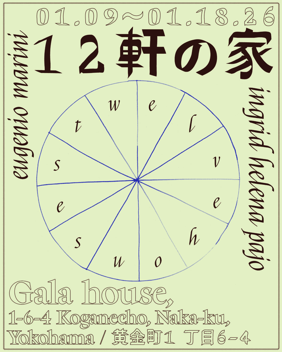 展覧会「Twelve houses」は、私たちが黄金町で過ごした12週間を記録する、ひとつのマテリアル・ジャーナルとして機能しています。この期間に見つけたもの――それは物であり、風景でもありますが――それらは広大な平面上に点のように散らばっており、私たちはその点と点のあいだに線を引くことで、イメージを立ち上げてきました。そうして生まれたものが「12の家」であり、私たちそれぞれの個人的な星座であり、同時に本展の最終的な作品でもあります。