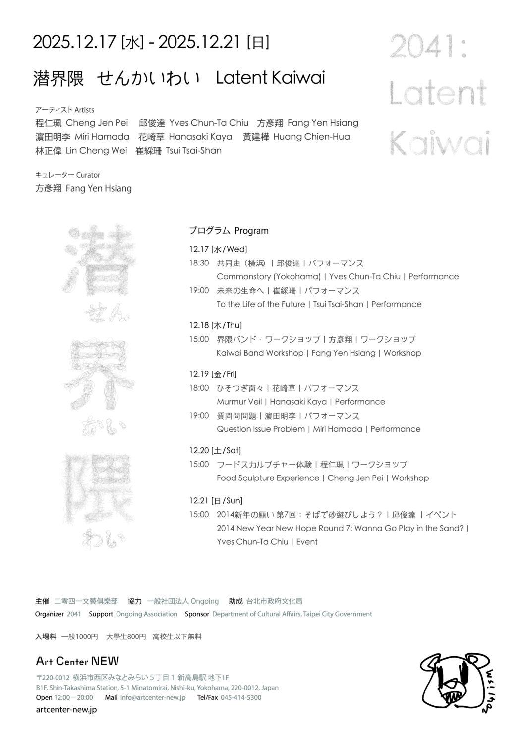 黄金町レジデンスアーティスト程仁珮が所属するアート・コレクティヴ「2041」が、12月7日から12月21日までArt Center NEWでグループ展を開催します!ぜひArt Center NEWまで足を運んでご覧ください。