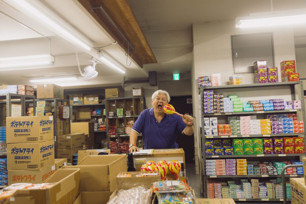 (株)佐野屋本店の主な仕事は、地域のショッピングモールやイベント、学校行事などからの注文に対応し、お菓子やおもちゃを仕入れ、梱包・配送すること。店内には、昔懐かしい駄菓子やカラフルな玩具がずらりと並び、まるで子どもの頃に夢見たような空間が広がっている。