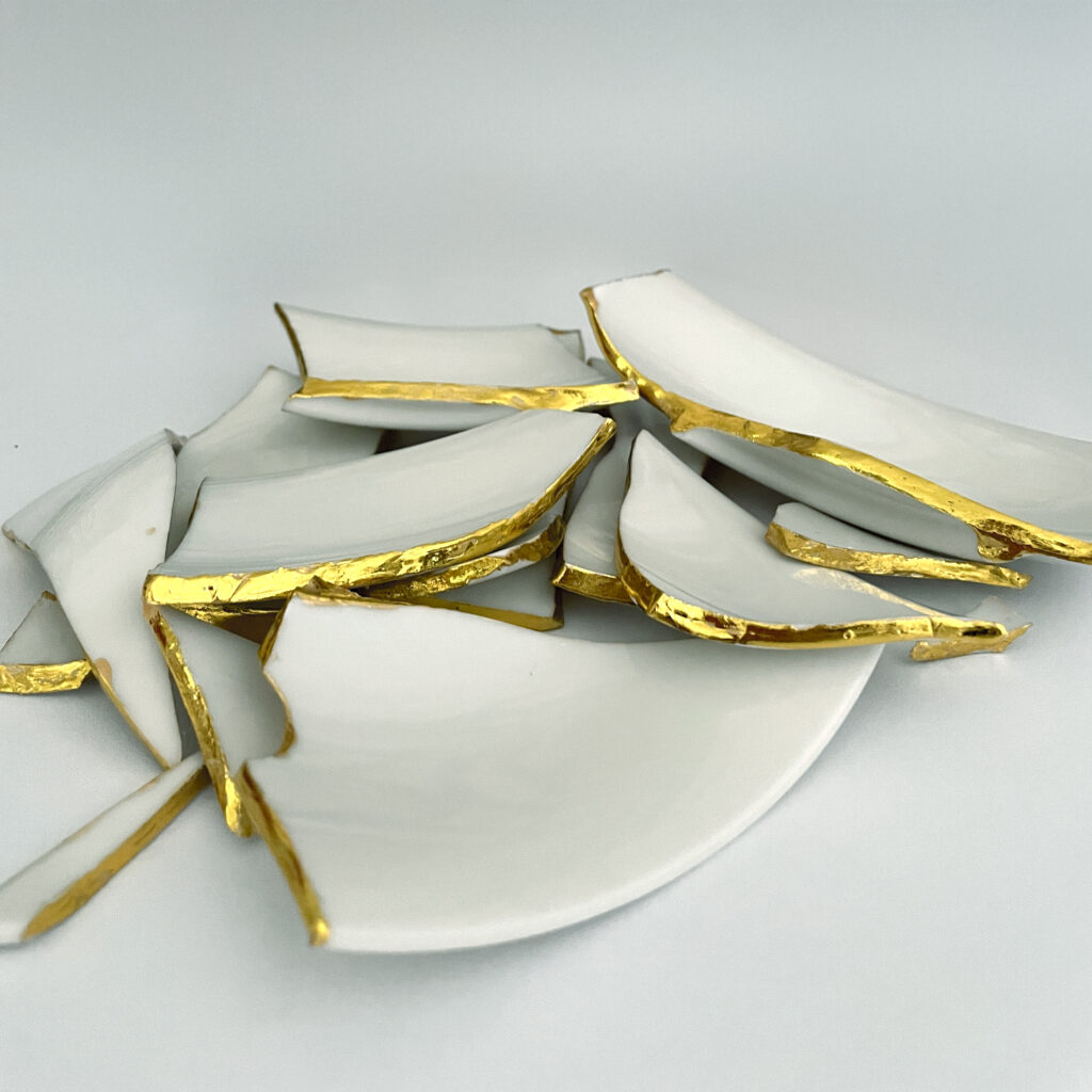 During the exhibition, the artist stays present, applying gold to the broken edges without joining them back together — an ongoing act of “un-kintsugi” — and returning the fragments to the growing pile on the first floor.
