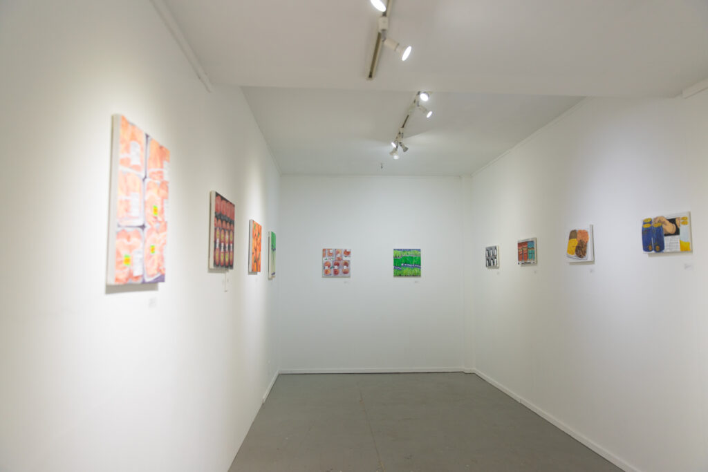 日常的に誰しもが行くスーパーやコンビニ等の店舗と、その中を行きかう人々の姿のメージの背後に、政治、経済、災害等の私たちの生活と切り離せない問題を滲ませる意図を込めた絵画作品を制作している。